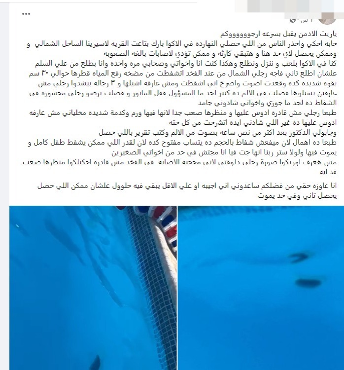 وقالت صاحبة الواقعة ،" حابه احكي واحذر الناس من اللي حصلي النهارده في الاكوا بارك بتاعت القريه لاسيرينا الساحل الشمالي و وممكن يحصل لاي حد هنا و هتبقي كارثه و ممكن تؤدي لاصابات بالغه الصعوبه كنا في الاكوا بلعب و ننزل ونطلع وهكذا كنت انا واخواتي وصحابي مره واحده وانا بطلع من علي السلم علشان اطلع تاني فاجه رجلي الشمال من عند الفخد اتشفطت من مضخه رفع المياه قطرها حوالي 30 سم بقوه شديده كده وقعدت اصوت واصرخ اني اشفطت ومش عارفه اشيلها و 3 رجاله بيشدوا رجلي مش عارفين يشيلوها فضلت في الالم ده كتير لحد ما المسؤول قفل الماتور و فضلت برضو رجلي محشوره في الشفاط ده لحد ما جوزي واخواتي شادوني جامد".