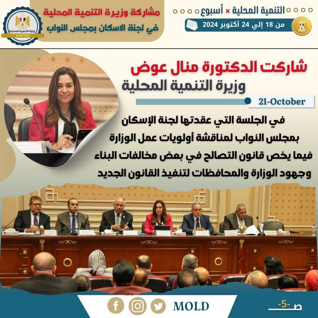 كما شاركت الدكتورة منال عوض وزيرة التنمية المحلية، في الجلسة التي عقدتها لجنة الإسكان بمجلس النواب لمناقشة أولويات عمل الوزارة فيما يخص قانون التصالح في بعض مخالفات البناء وجهود الوزارة والمحافظات لتنفيذ القانون الجديد وذلك بحضور المستشار محمود فوزي وزير الشئون النيابية والقانونية والتواصل السياسي و النائب محمد عطية الفيومي رئيس لجنة الإسكان والنائب أحمد السجينى رئيس لجنة الإدارة المحلية ووكلاء وعدد من أعضاء لجنتي الإسكان والتنمية المحلية وقيادات وزارة التنمية المحلية والإسكان وبعض الوزارات المعنية .