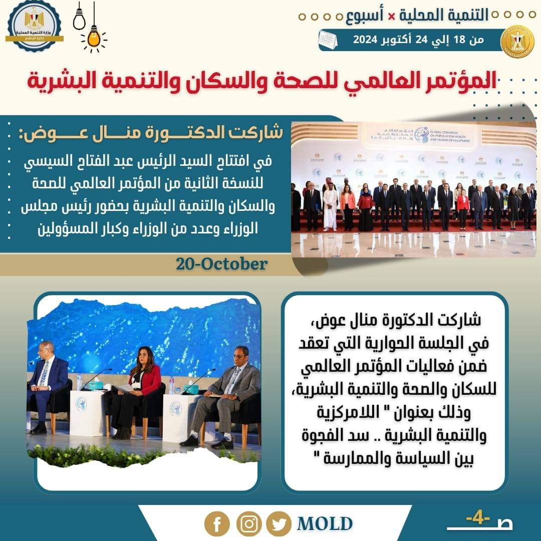 كما شاركت الدكتورة منال عوض وزيرة التنمية المحلية، في افتتاح السيد الرئيس عبد الفتاح السيسي للنسخة الثانية من المؤتمر العالمي للصحة والسكان والتنمية البشرية والذي عقد بالعاصمة الإدارية الجديدة بحضور رئيس مجلس الوزراء وعدد من الوزراء وكبار المسؤولين.