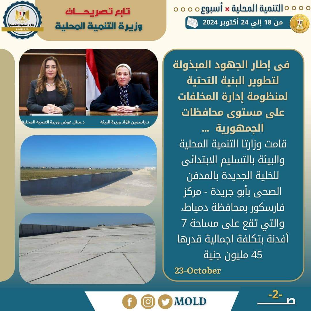 وقامت وزارتا التنمية المحلية والبيئة بالتسليم الابتدائي للخلية الجديدة بالمدفن الصحي بأبو جريدة - مركز فارسكور بمحافظة دمياط، والتي تقع على مساحة 7 أفدنة بتكلفة اجمالية قدرها 45 مليون جنيه، وذلك من خلال اللجنة المشكلة من وزارات (البيئة، التنمية المحلية ووزارة الدفاع ممثلة في الكلية الفنية العسكرية والهيئة العربية للتصنيع) والأكاديمية العربية للعلوم والنقل البحري، ومحافظة دمياط، وهى اللجنة المختصة بتسيير ومتابعة واستلام مشروعات البنية التحتية ضمن برامج المنظومة.