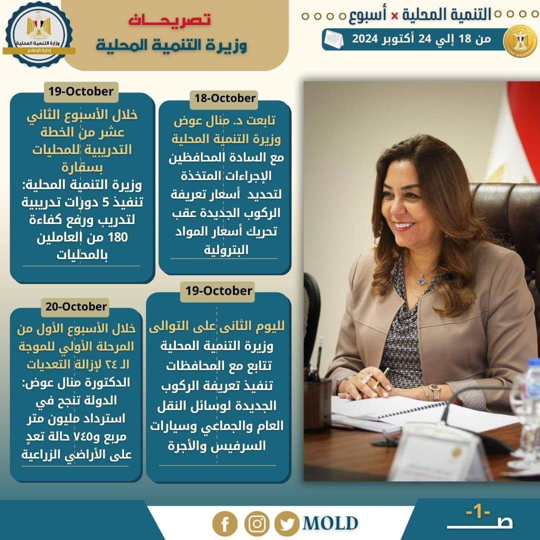 كما تابعت الدكتورة منال عوض وزيرة التنمية المحلية، مع السادة المحافظين الإجراءات المتخذة لتحديد أسعار تعريفة الركوب الجديدة لجميع المواصلات العامة الخطوط الداخلية والخارجية (سيارات الميكروباص والسرفيس والنقل الجماعي) وذلك عقب قرار لجنة التسعير التلقائي للمنتجات البترولية وزيادة أسعار البنزين و السولار اعتباراً من اليوم الموافق ١٨ - ١٠ - ٢٠٢٤ .