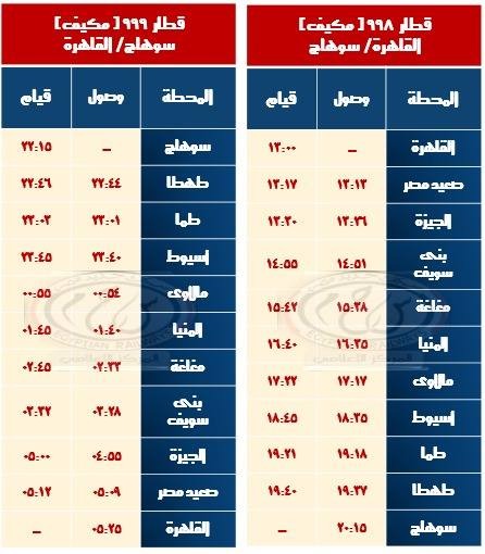 وتقرر اعتباراً من يوم الاربعاء الموافق 30 /10 / 2024 تشغيل قطار 998 القاهرة / سوهاج بتركيب 9 عربات مكيفة فرنساوى مطور يقوم من محطة القاهرة الساعة 01:00ظهراً ويصل محطة سوهاج الساعة 08:15 مساءاً ، ويعود بقطار 999 سوهاج / القاهرة على ان يقوم من محطة سوهاج الساعة 10:15 مساءاً ويصل محطة القاهرة الساعة 05:25 صباح اليوم التالى بنفس التركيب الوارد به قطار 998 لمحطة سوهاج طبقاً للجداول المرفقة.