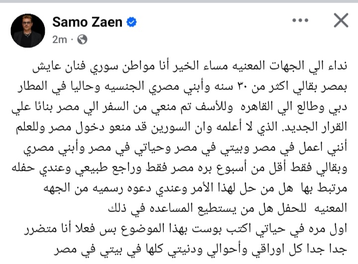 وكتب ساموزين عبر صفحته الرسمية قائلًا: "نداء إلي الجهات المعنية مساء الخير أنا مواطن سوري فنان عايش بمصر بقالي اكثر من ٣٠ سنه وأبني مصري الجنسيه وحاليا في المطار دبي وطالع الي القاهره وللأسف تم منعي من السفر إلي مصر بناء علي القرار الجديد. الذي لا أعلمه وأن السوريين قد منعوا من دخول مصر وللعلم أنني أعمل في مصر وبيتي في مصر وحياتي في مصر وأبني مصري وبقالي فقط أقل من أسبوع بره مصر فقط وراجع طبيعي وعندي حفلة مرتبط بها.. هل من حل لهذا الأمر؟ وعندي دعوة رسمية من الجهة المعنية للحفل".