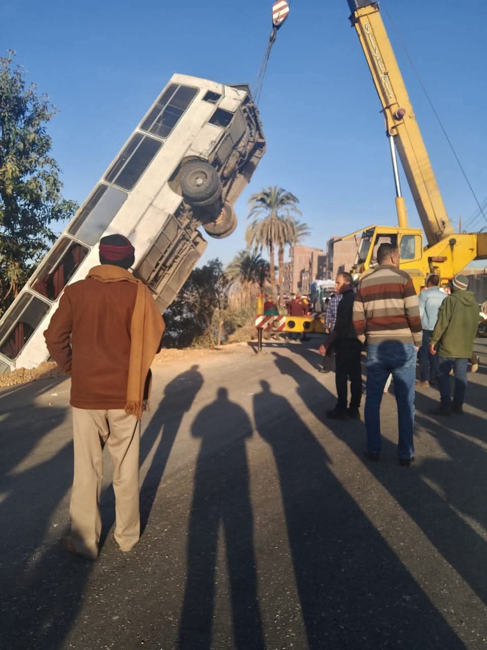 كارثة على الطريق.. إنقاذ 40 عاملا من حادث انقلاب أتوبيس مصنع سكر جرجا