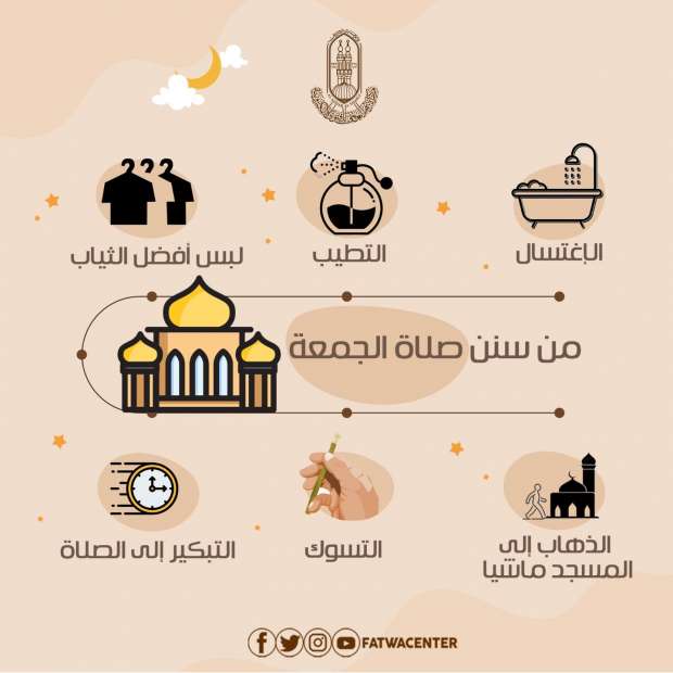 ونشر مركز الأزهر العالمي للفتوى الإلكترونية، عبر صفحته الرسمية على «فيس بوك»، السنن الخاصة بصلاة الجمعة، والتي جاءت على النحو التالي: