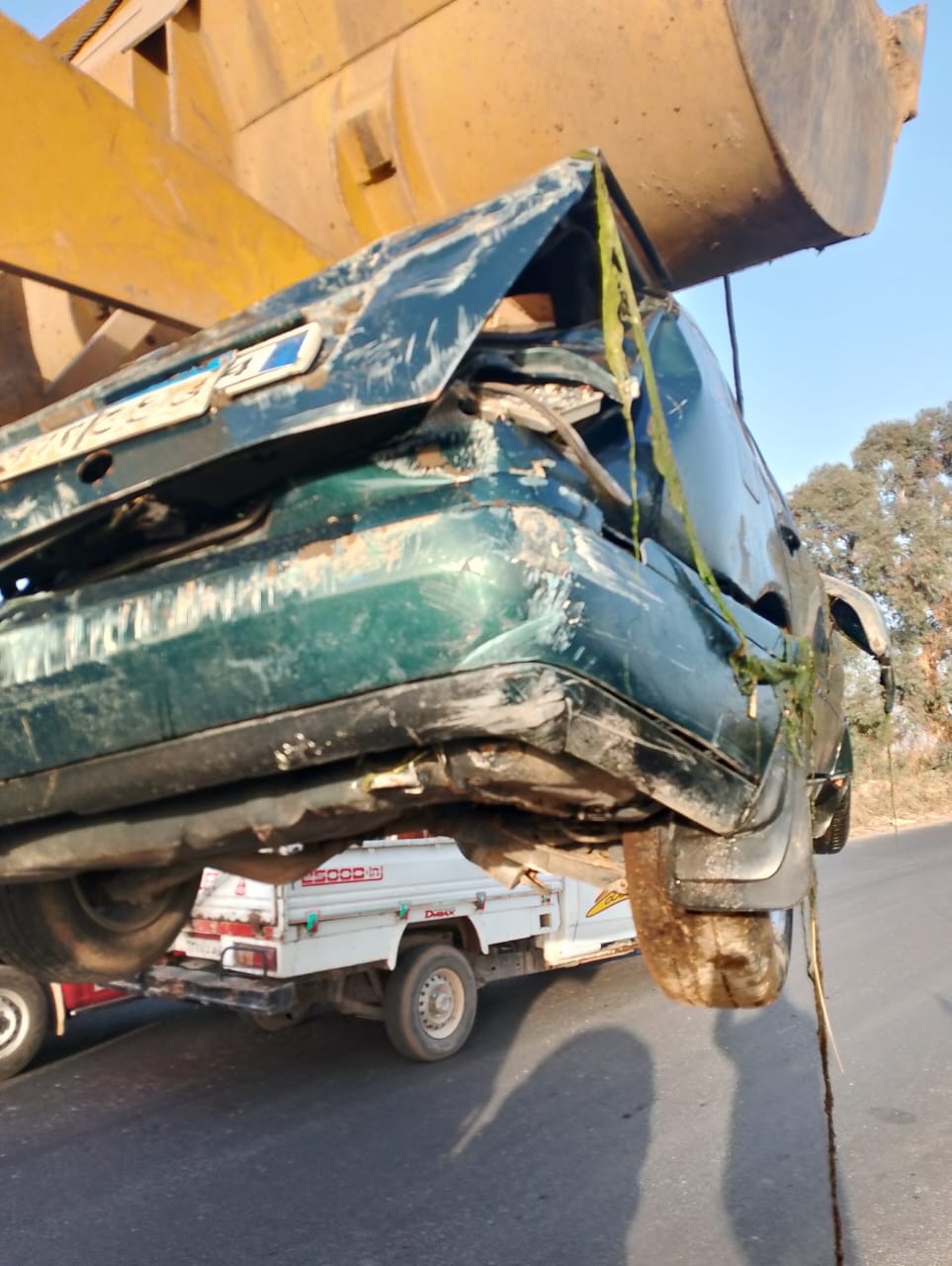 وبالفحص والمعاينة تبين حدوث تصادم بين سيارة ملاكى وأخرى نقل أدى إلي سقوط السيارة الملاكى رقم "4962" ى ع ج بأحد الترع بالقرب من كوبرى النص بالقرب من كوديه دائرة المركز ولاذت النقل بالفرار .