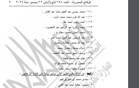 وكشفت الجريدة الرسمية، أنه بعد الاطلاع على القانون رقم 8 لسنة ۲۰۱۵ بشأن تنظيم قوائم الكيانات الإرهابية والإرهابيين وتعديلاته، وعلى قرار الإدراج رقم 3 لسنة ۲۰۲۳ إدراج إرهابيين الصادر من محكمة جنايات القاهرة الدائرة الأولى جنائي (بدر) في القضية رقم ٤٤٥٩ لسنة ۲۰۱۵ جنايات حلوان المقيدة برقم ۳۲۱ لسنة ۲۰۱٥ كلى جنوب القاهرة المقيدة برقم ٤٥١ لسنة ۲۰۱١٤ حصر أمن دولة عليا المنشور بجريدة الوقائع المصرية بالعدد رقم تابع ( أ ) في 9 أبريل سنة ٢٠٢٣ ؛ ۸۳ وعلى الحكم الصادر من محكمة جنايات القاهرة بتاريخ ٢٠٢٢/٦/٢٨ بشأن القضية رقم ٤٤٥٩ لسنة ۲۰۱۵ جنايات حلوان المقيدة برقم ٣٢١ لسنة ٢٠١٥ كلى جنوب القاهرة ؛ وعلى الحكم البات الصادر من محكمة النقض في الطعن رقم ۱۹۰۷۱ لسنة ٩٢ قضائية بتاريخ ٢٠٢٤/١/٢٣ ؛ وعلى الحكم الصادر من محكمة جنايات القاهرة بتاريخ ۲۰۲۳/۳/۱۸ بشأن القضية رقم ٤٤٥٩ لسنة ۲۰۱۵ جنايات حلوان المقيدة برقم ٣٢١ لسنة ٢٠١٥، إنهاء أثر قرار الإدراج رقم 3 لسنة ٢٠٢٣ إدراج إرهابيين ، المنشور بجريدة الوقائع المصرية