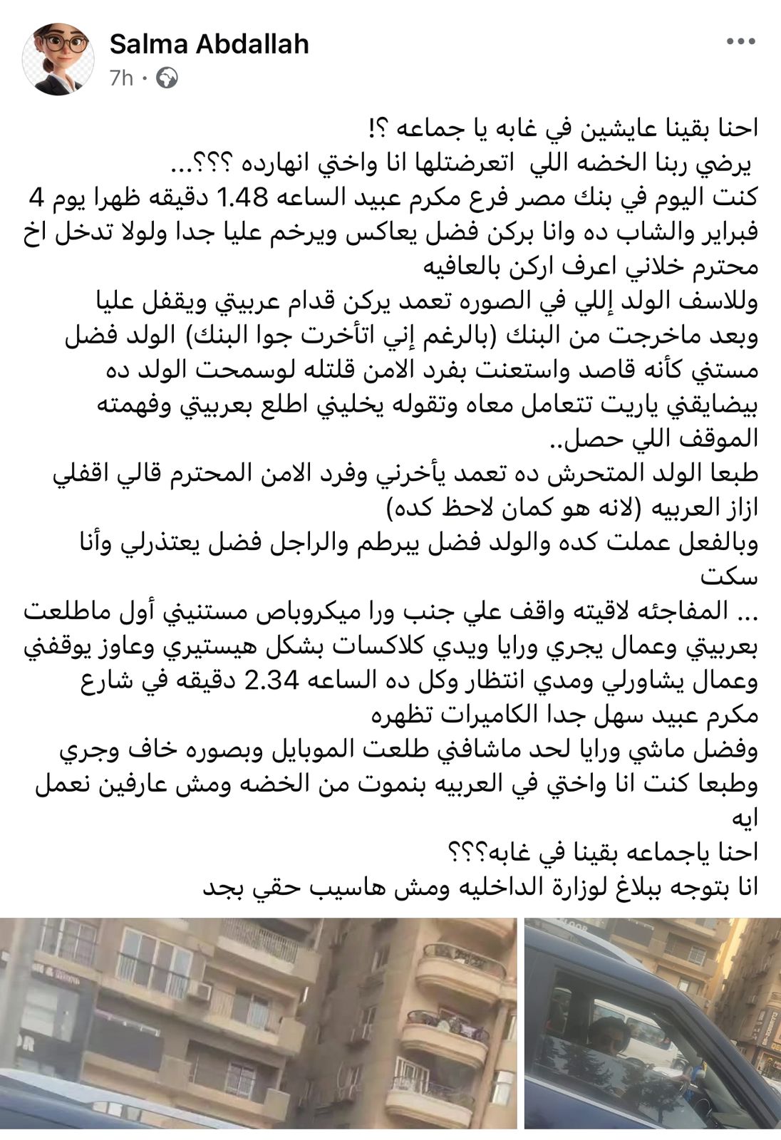وقالت الفتاة عبر منشور لها على صفحتها الرسمية على موقع "فيس بوك" إن الواقعة حدثت صباح يوم 4 فبراير 2025، حينما كانت داخل بنك مصر فرع مكرم عبيد، حيث فوجئت بشاب يعاكسها ويزعجها بشكل متعمد أثناء محاولتها ركن سيارتها.