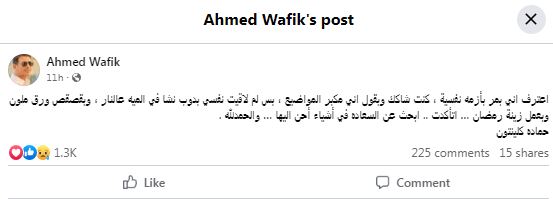 وكتب أحمد وفيق عبر صفحته الرسمية "فيس بوك" " اعترف اني بمر بأزمة نفسية ، كنت شاكك وبقول اني مكبر المواضيع ، بس لم لاقيت نفسي بدوب نشا في الميه ع النار ، وبقصقص ورق ملون وبعمل زينة رمضان … اتأكدت .. ابحث عن السعادة في أشياء أحن إليها … والحمدلله ".