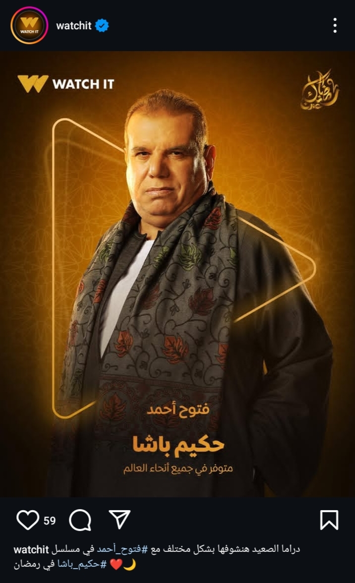 ونشرت منصة Watch it الرقمية البوستر الخاص بـ فتوح أحمد من خلال حسابها الرسمي عبر موقع تبادل الصور والفديوهات القصيرة “إنستجرام” معلقا: “ دراما الصعيد هنشوفها بشكل مختلف مع فتوح أحمد في مسلسل حكيم باشا في رمضان 2025 علي Watch it”.