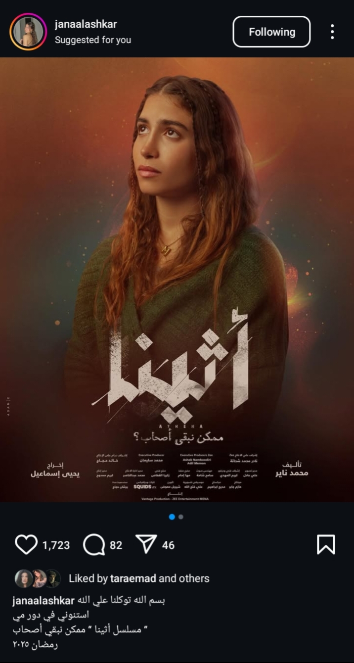 ونشرت جنه الأشقر البوستر الفردي الخاص بها في مسلسل أثينا، من خلال حسابها الرسمي عبر موقع تبادل الصور والفديوهات القصيرة "إنستجرام" وعقلت: “ بسم الله توكلنا علي الله، استنوني في دور مي في مسلسل أثينا ممكن نبقي صحاب، رمضان 2025”.