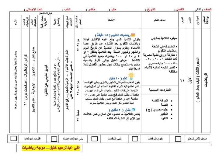 يتضمن دفتر تحضير مادة الرياضيات للصف الثاني الابتدائي الترم الثاني عدة عناصر أساسية، منها: