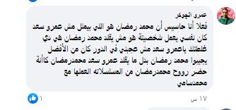 وشبه المتابعين بالفنان محمد رمضان، وجاءت الكثير من التعليقات التي تسخر منه بسبب تقليده لمحمد رمضان في مسلسله نسر الصعيد، وجاءت تعليقات المتابعين كالتالي: “ محمد رمضان في صورة عمرو سعد والتقليد الأهبل”، “ محمد رمضان ده ولا مين” ، “محمد رمضان نمبر وان”، بيقلد محمد رمضان"، “ محمد باشا رمضان”، “ كلها بقت عايزه اعمل محمد رمضان”، والكثير من التعليقات الأخري.