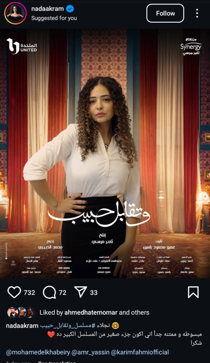 وشارك ندي كرم جمهورهل البوستر الفردي لها في مسلسل وتقابل حبيب، وذلك من خلال حسابها الرسمي عبر موقع تبادل الصور والفديوهات القصيرة "إنستجرام"، وعلقت: “ نجلاء في مسلسل وتقابل حبيب.. مبسوطة وممتنه جدًا اني اكون جزء صغير في المسلسل الكبير ده.. شكرًا”.