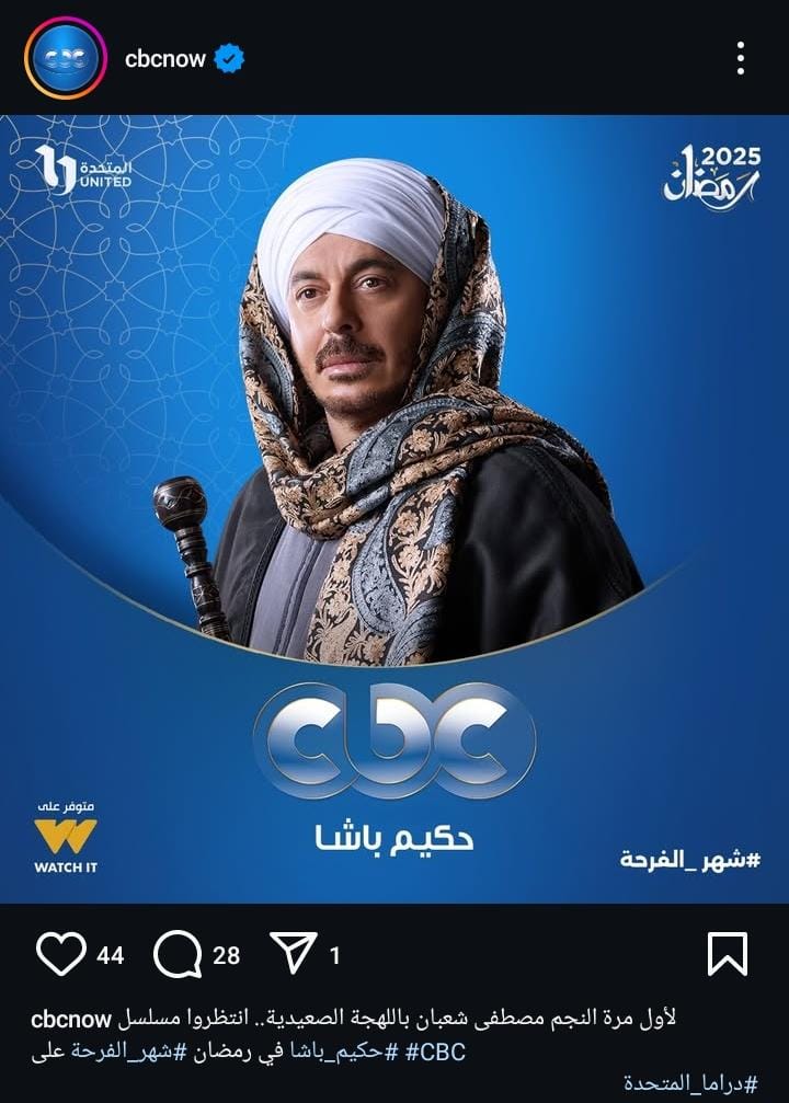 حيث أعلنت شبكة قناة CBC عن عرض مسلسل حكيم باشا بطولة مصطفي شعبان حصريًا علي شاشتها في موسم دراما رمضان 2025، ونشرت سي بي سي البوستر الفردي لـ مصطفي شعبان في المسلسل من خلال حسابها الرسمي عبر موقع تبادل الصور والفديوهات القصيرة “إنستجرام”، وعلقت: “ لاول مرة النجم مصطفي شعبان باللهجة الصعيدية.. انتظروا مسلسل حكيم باشا في رمضان شهر الفرحة علي CBC”.