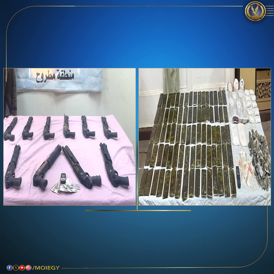 مطروح: ضبط 4 عناصر إجرامية في عمليتين منفصلتين، بحوزتهم 64.5 كجم حشيش، بندقية خرطوش، وعدد من الطلقات، بالإضافة إلى ضبط عنصر إجرامي بحوزته 10 بنادق خرطوش بدائرة قسم شرطة سيدي براني.