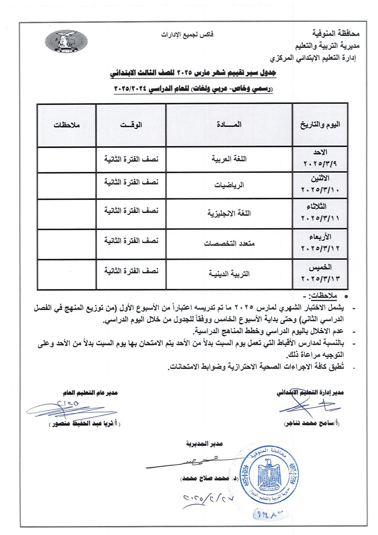 وبذلك يكون جدول امتحانات شهر مارس 2025 لسنوات النقل للصف الثالث الابتدائي يشمل جميع المواد الأساسية التي درسها الطلاب خلال الأسابيع الماضية.