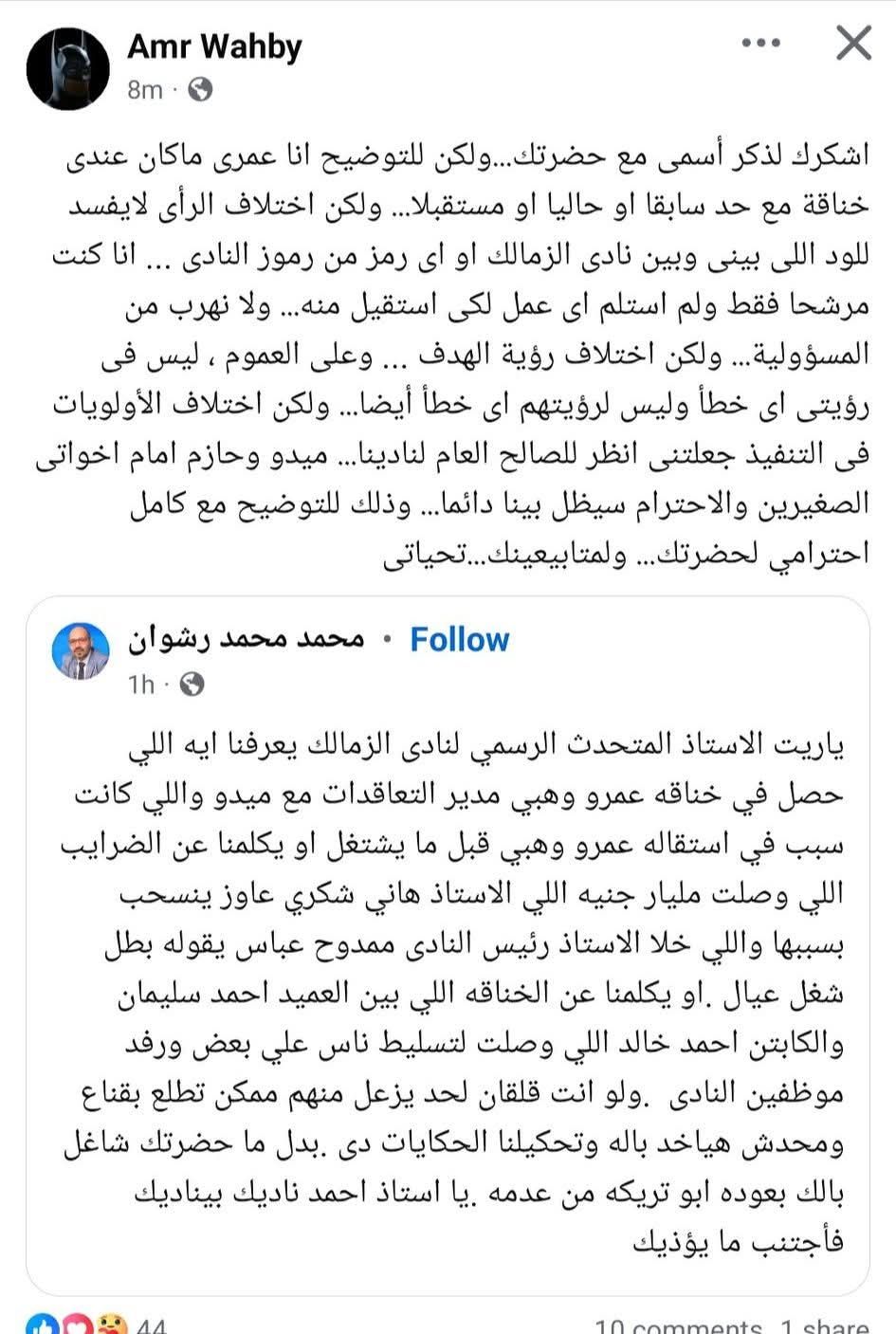 وتابع “وهبي”، "وعلى العموم، ليس فى رؤيتى أى خطأ وليس لرؤيتهم أى خطأ أيضًا.. ولكن اختلاف الأولويات فى التنفيذ جعلتنى أنظر للصالح العام لنادينا.. ميدو وحازم إمام أخواتى الصغيرين والاحترام سيظل بينا دائمًا... وذلك للتوضيح مع كامل احترامي لحضرتك... ولمتابعينك..تحياتى".
