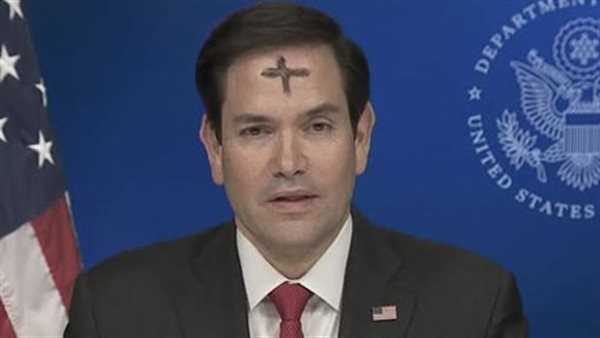 ظهر وزير الخارجية الأميركي ماركو روبيو ، راسما الصليب على جبهته خلال لقاء صحفي لمناقشة مواقف الرئيس الأمريكي دونالد ترامب حول غزة وحماس وأوكرانيا.