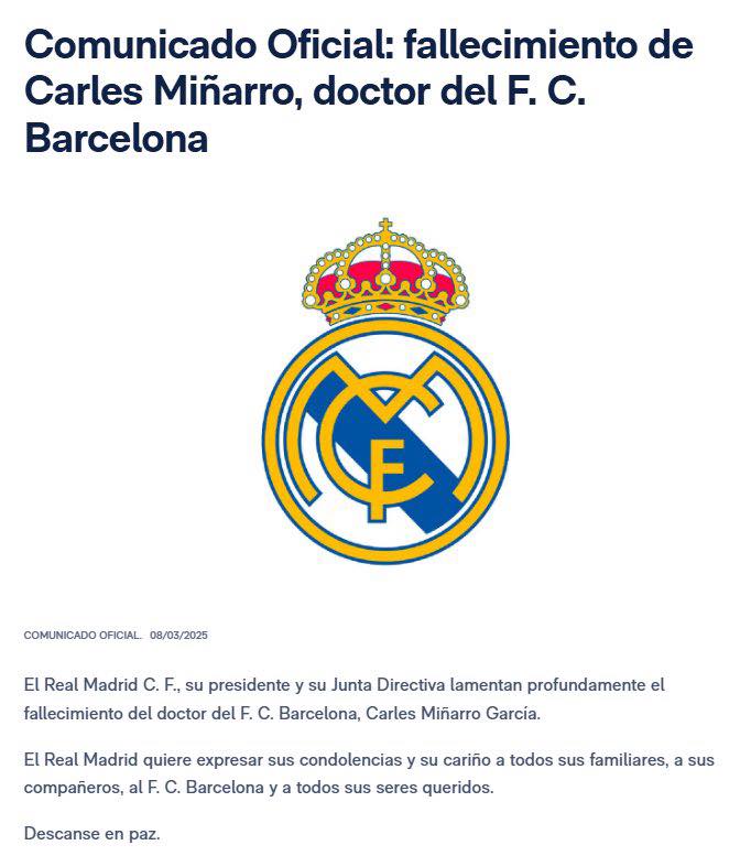 يعرب نادي ريال مدريد ورئيسه ومجلس إدارته عن حزنهم العميق لوفاة طبيب نادي برشلونة، كارليس مينيارو جارسيا.