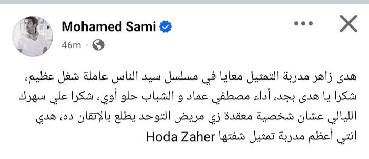 وكتب محمد سامي من خلال حسابه الرسمي عبر موقع التواصل الاجتماعي "فيسبوك"، وقال:" هدى زاهر مدربة التمثيل معايا في مسلسل سيد الناس عاملة شغل عظيم، شكرا يا هدى بجد، أداء مصطفي عماد و الشباب حلو أوي، شكرا علي سهرك الليالي عشان شخصية معقدة زي مريض التوحد يطلع بالإتقان ده، هدي انتي أعظم مدربة تمثيل شفتها".