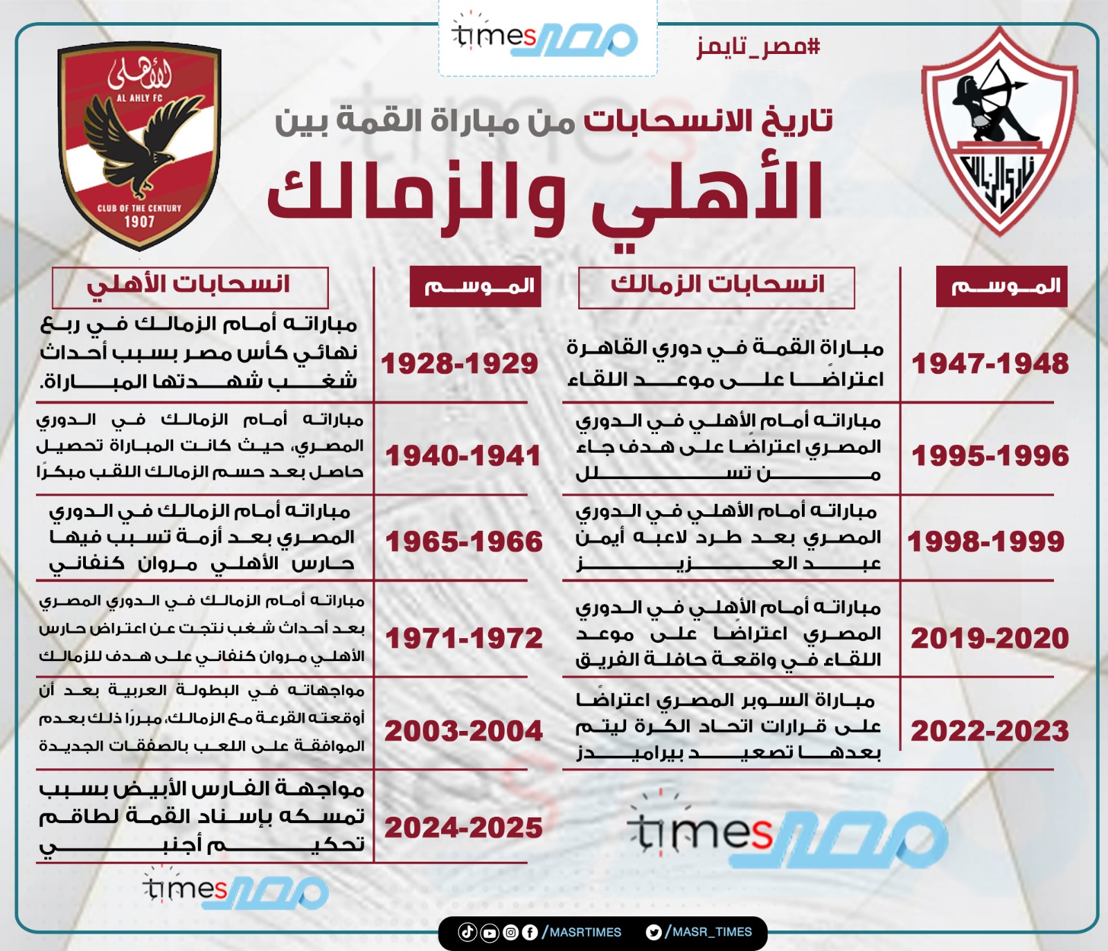 1- موسم 1947-1948: انسحب الزمالك من مباراة القمة في دوري القاهرة اعتراضًا على موعد اللقاء.