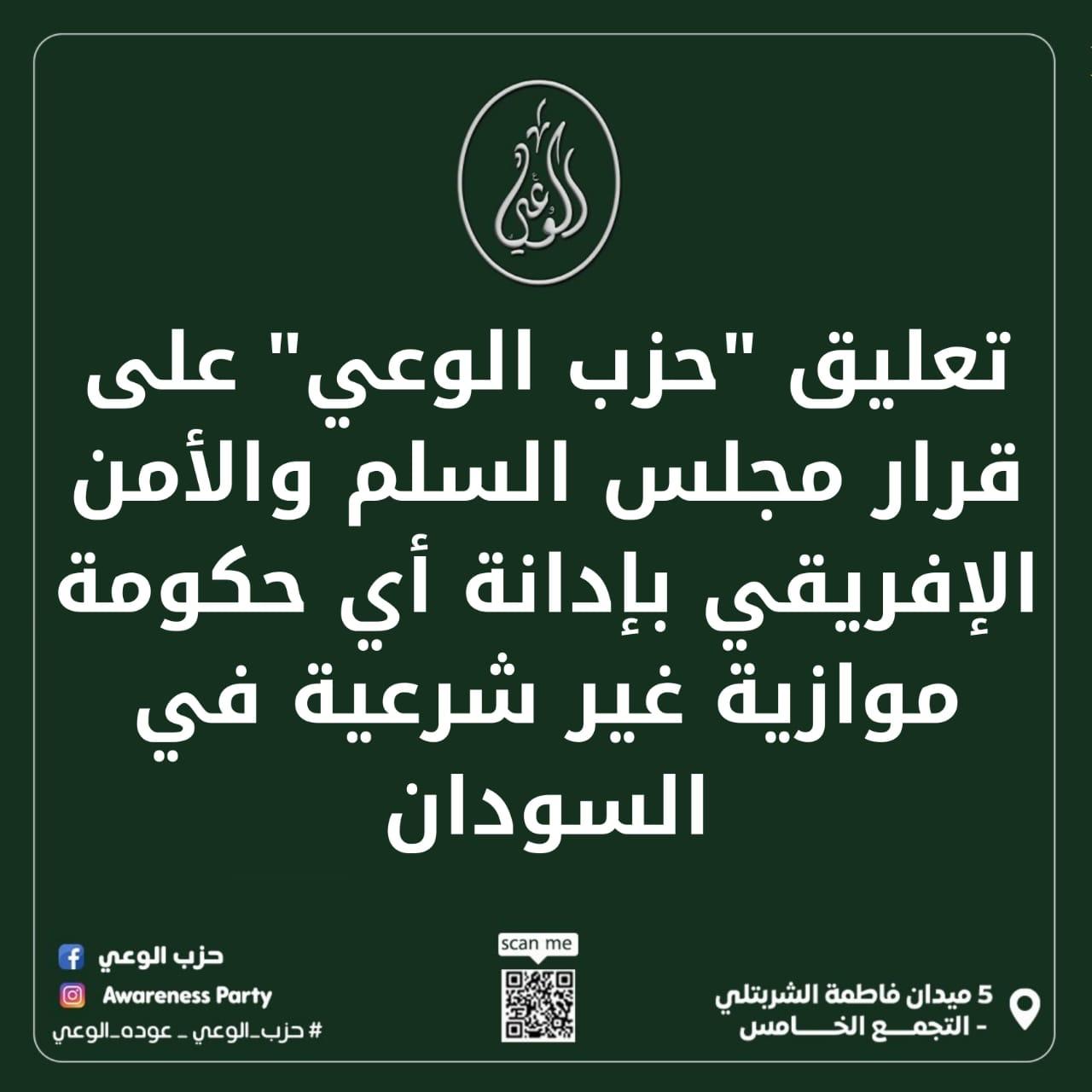 إن "حزب الوعي" إذ يؤكد رفضه القاطع لأي حكومة أو كيان موازي "غير شرعي"، فإنه يشدد على أن السلام الشامل والعادل، والتنمية المستدامة، والعدالة الانتقالية، هي الطريق الوحيد لإنهاء الأزمة في السودان، وإعادة بناء الدولة على أسس جديدة تحقق تطلعات الشعب السوداني الشقيق.