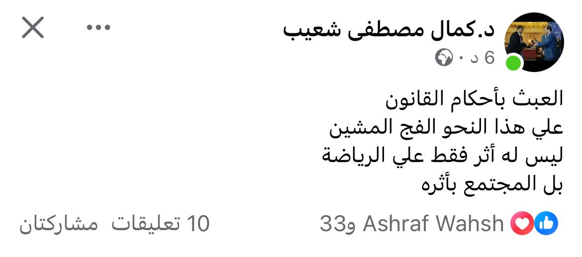 وقال “شعيب” عبر حسابه الشخصي على موقع التواصل الاجتماعي “فسيبوك”،"العبث بأحكام القانون علي هذا النحو الفج المشين ليس له أثر فقط علي الرياضة بل المجتمع بأثره".