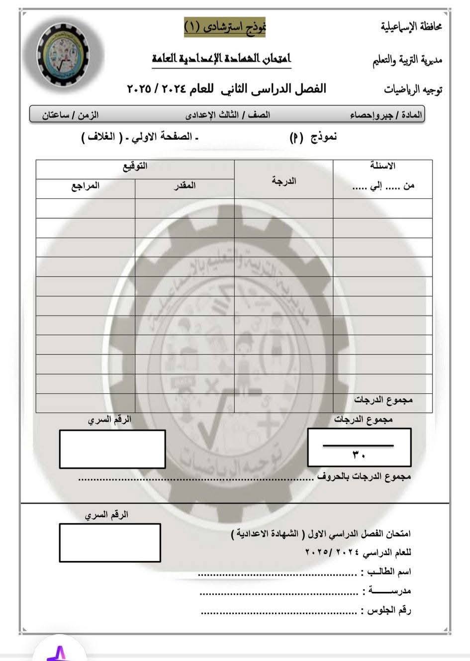 نموذج الامتحان التجريبي للشهادة الإعدادية محافظة الإسماعيلية
