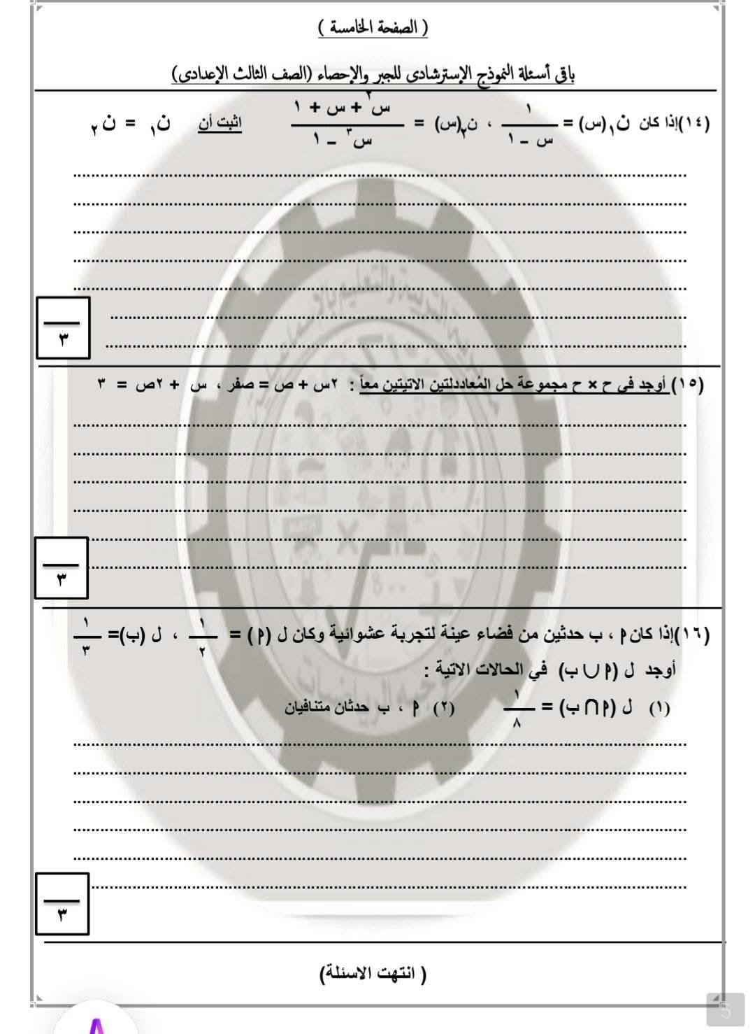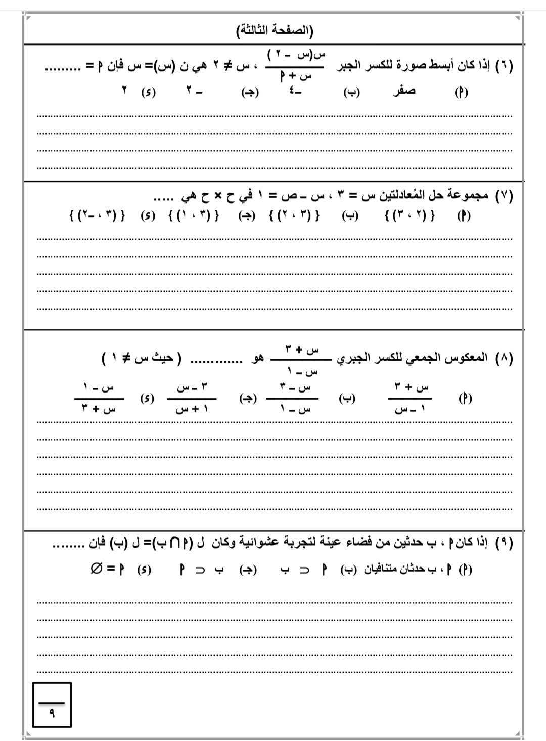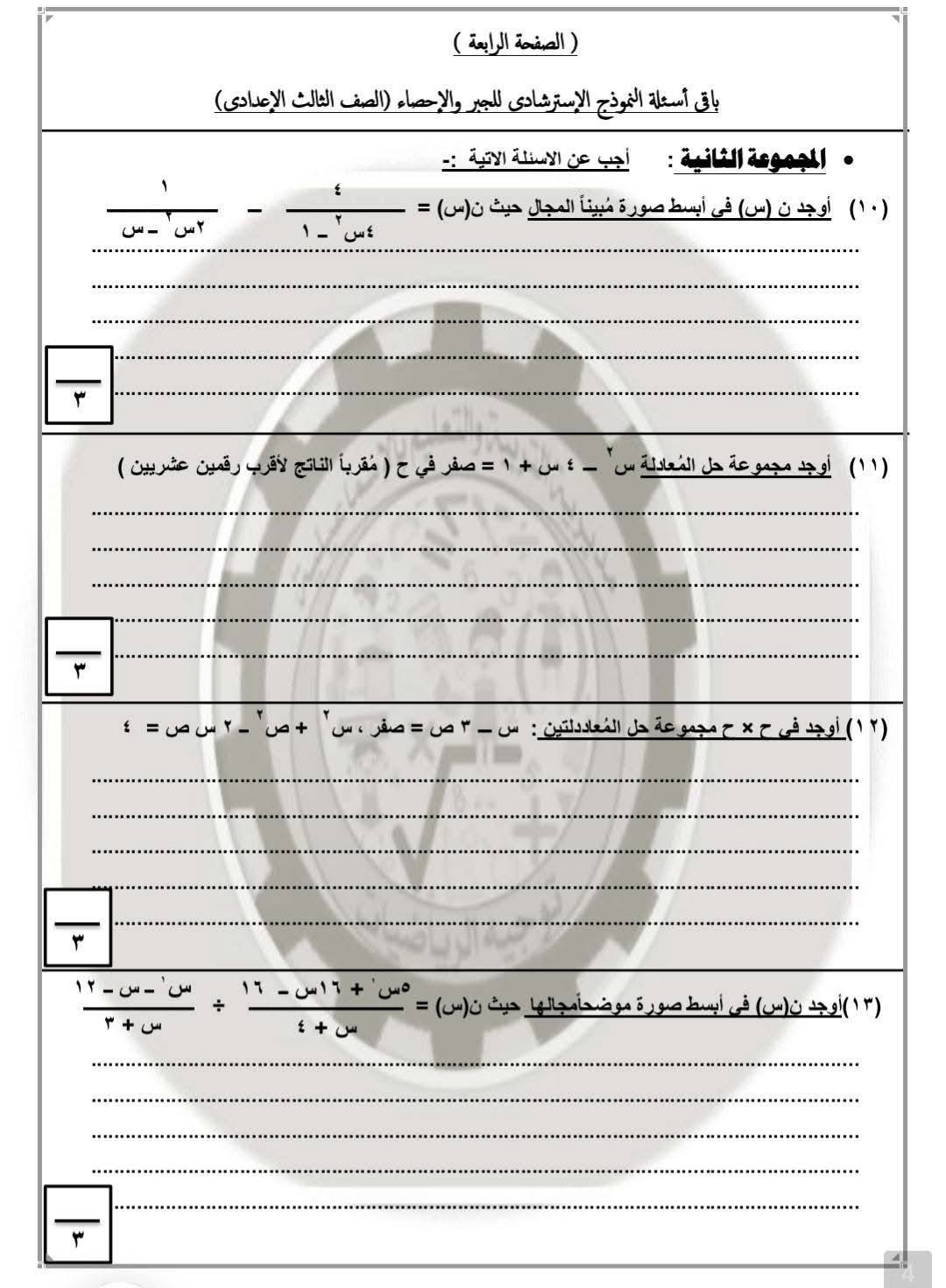 نموذج الامتحان التجريبي للشهادة الإعدادية مادة الجبر