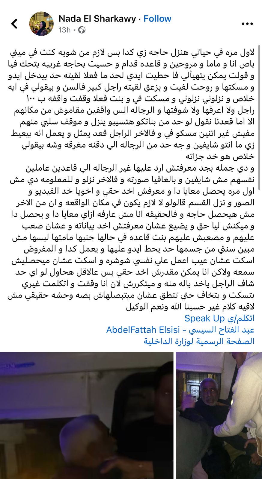 وتابعت،" فالاخر الراجل قعد يمثل و يعمل انه بيعيط زي ما انتو شايفين و جه حد من الرجاله الي دقنه مغرقه وشه بيقولي خلاص هو خد جزاته ودي جمله بجد معرفتش ارد عليها غير الرجاله الي قاعدين عاملين نفسهم مش شايفين و بالعافيا صورته و فالاخر نزلوه".