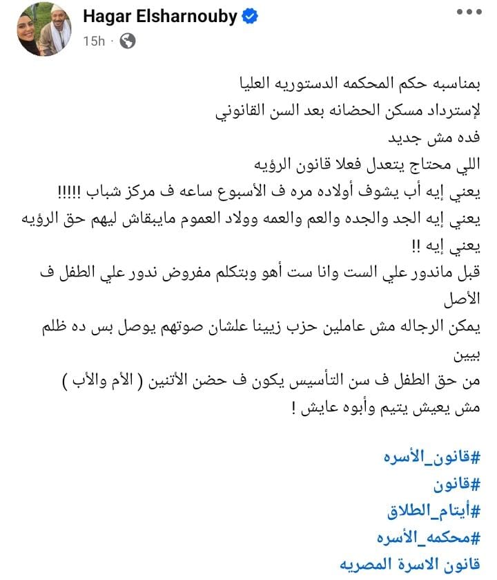 وكتبت هاجر الشرنوبي من خلال حسابها الرسمي عبر موقع التواصل الاجتماعي “فيسبوك”، قالت: "بمناسبه حكم المحكمه الدستوريه العليا