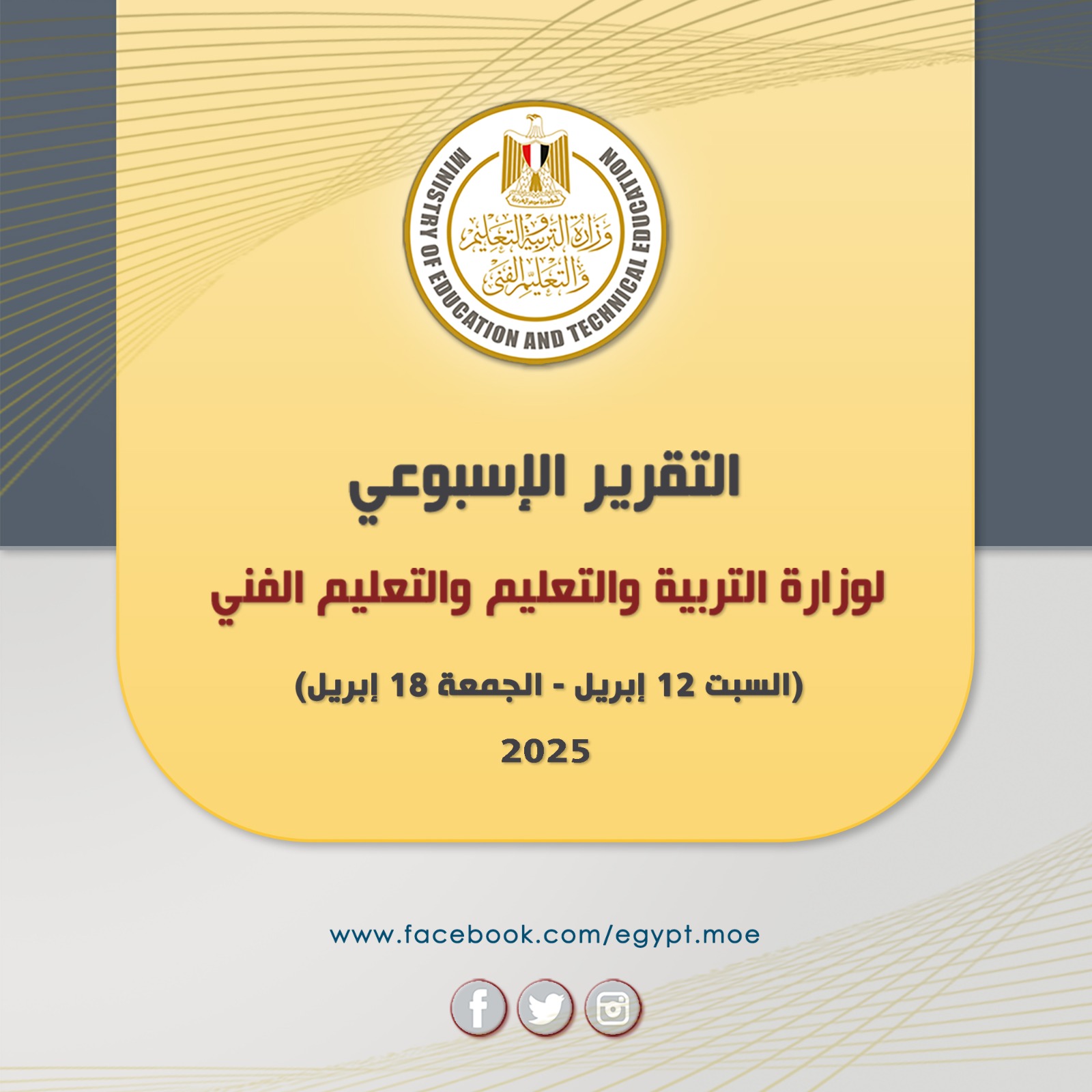 أصدر المركز الإعلامي لوزارة التربية والتعليم والتعليم الفني التقرير الأسبوعي للوزارة خلال الفترة من (السبت ١٢ إبريل – الجمعة ١٨ إبريل ٢٠٢٥ ) ويتضمن ما يلى :