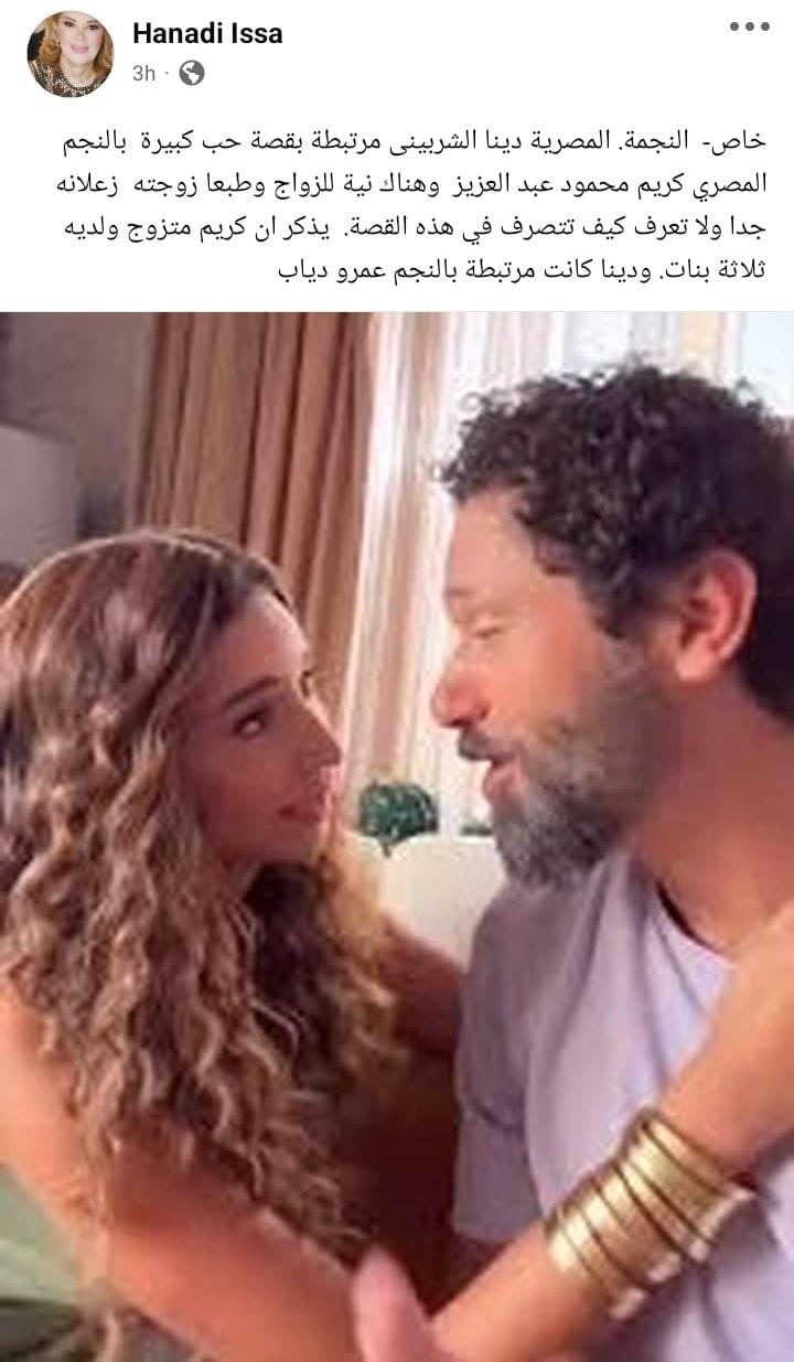 وكتبت هنادي عيسي من خلال حسابها الرسمي عبر موقع التواصل الاجتماعي “فيسبوك”: “النجمة المصرية دينا الشربيني مرتبطة بقصة حب كبيرة بالنجم المصري كريم محمود عبد العزيز وهناك نية للزواج و طبعا زوجته زعلانة جدا، ولا تعرف كيف تتصرف في هذه القصة”.