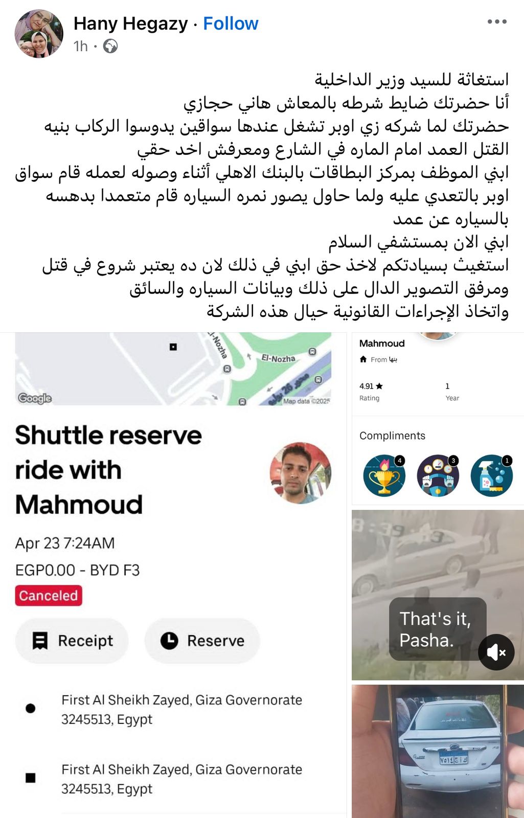 وتابع،" ابني الموظف بمركز البطاقات بالبنك الأهلي أثناء وصوله لعمله قام سواق اوبر بالتعدي عليه ولما حاول يصور نمره السياره قام متعمدا بدهسه بالسياره عن عمد ابني الان بمستشفي السلام ..استغيث بسيادتكم لاخذ حق ابني في ذلك لان ده يعتبر شروع في قتل ومرفق التصوير الدال على ذلك وبيانات السياره والسائق واتخاذ الإجراءات القانونية حيال هذه الشركة".