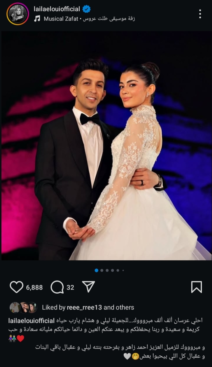 ونشرت ليلي علوي صور من حفل الزفاف، من خلال حسابها الرسمي عبر موقع تبادل الصور والفديوهات القصيرة إنستجرام، وكتبت: "احلي عرسان ألف ألف مبروك.. للجميلة ليلي وهشام يارب حياة كريمة و سعيدة وربنا يحفظكم و يبعد عنكم العين دائما حياتكم مليانة سعادة وحب".