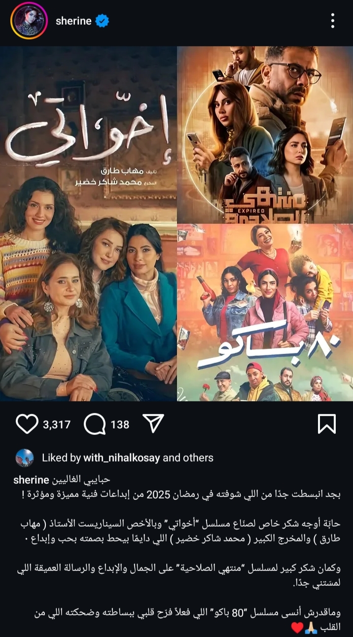 وكتبت شيرين من خلال حسابها الرسمي عبر موقع تبادل الصور والفديوهات القصيرة إنستجرام، وقالت: "حبايبي الغاليين.. بجد انبسطت جدًا من اللي شوفتة في رمضان 2025 من إبداعات فنية مميزة ومؤثرة".