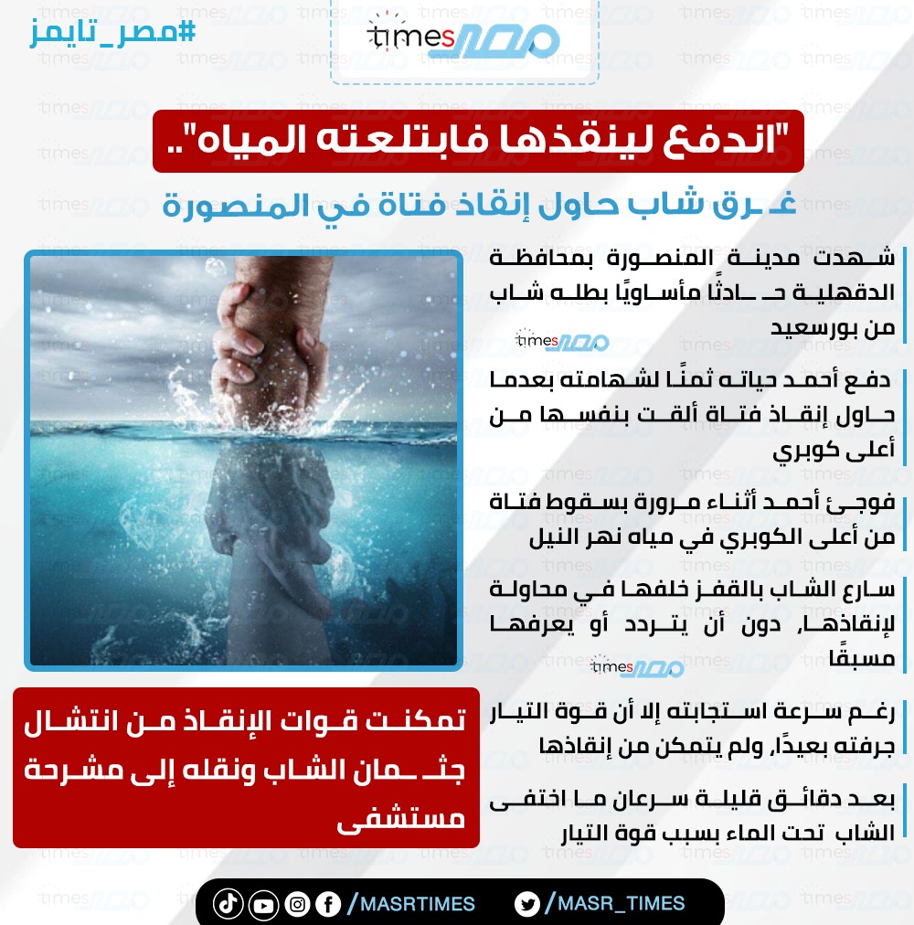 "اندفع لينقذها فابتلعته المياه".. مصرع شاب غرقًا حاول إنقاذ فتاة في المنصورة