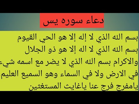 اللهم صل وسلم وبارك على سيدنا محمد وعلى آله وصحبه أجمعين، اللهم بحق سورة يس، وبحق من أنزلتها عليه، وبحق كل من قرأها، فرّج عني همي، ويسر لي أمري، واقضِ حاجتي، واغفر ذنبي، ووسع رزقي، واشفِ مريضي، وارحم موتاي، واهدِ أولادي، واكفني شر خلقك، وأعذني من الشيطان الرجيم، ومن شر كل ذي شر.