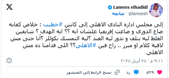 وقالت “الحديدي” عبر حسابها بمنصة “إكس”: “إلى مجلس إدارة النادى الأهلى إلى كابتن خطيب: خلاص كفاية ضاع الدورى وضاعت إفريقيا علشان إيه؟؟ إيه الهدف؟ شايفين الغلط ليه بنلف وندور ليه العند؟ ليه التمسك بكولر؟ أنا حتى مش لاقية كلام أو مبرر.. راح فين الأهلى؟؟ اللى قدامنا ده مش الأهلى”.