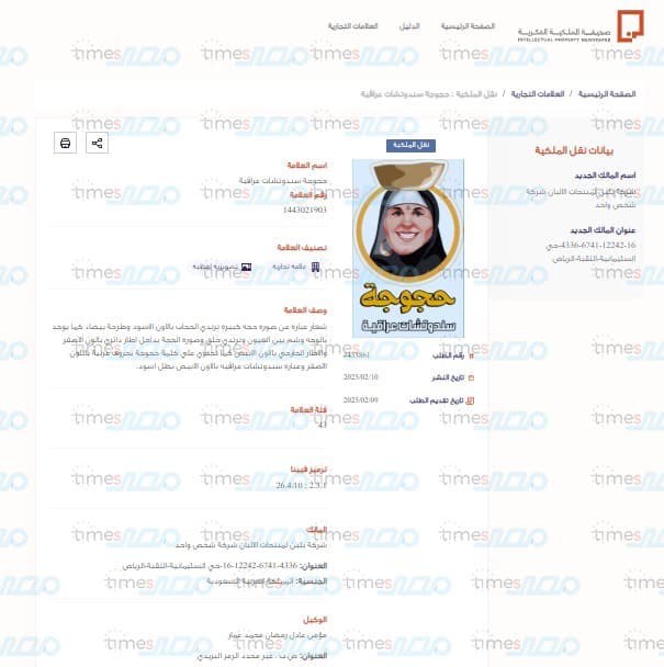 حصل "مصر تايمز" على مستند رسمي من صحيفة الملكية الفكرية السعودية، وهي منصة إلكترونية تابعة للهيئة السعودية للملكية الفكرية، تختص بنشر كافة الإجراءات المرتبطة بالملكية الفكرية مثل تسجيل العلامات التجارية وبراءات الاختراع وحقوق المؤلف والنماذج الصناعية.