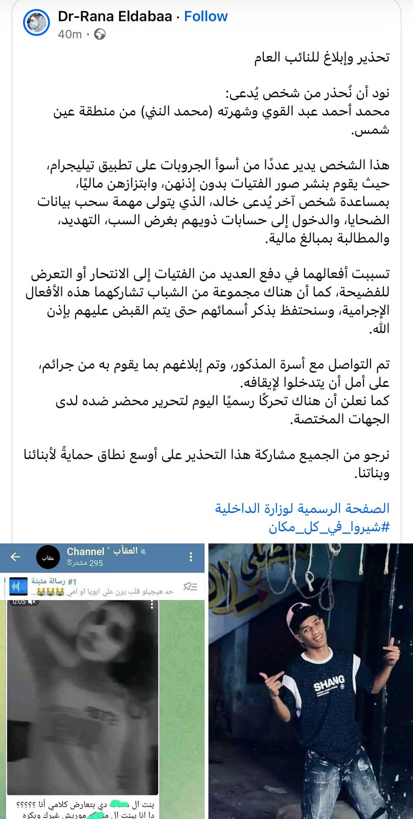 واستطردت،" تسببت أفعالهما في دفع العديد من الفتيات إلى الانتحار أو التعرض للفضيحة، كما أن هناك مجموعة من الشباب تشاركهما هذه الأفعال الإجرامية، وسنحتفظ بذكر أسمائهم حتى يتم القبض عليهم بإذن الله.. تم التواصل مع أسرة المذكور، وتم إبلاغهم بما يقوم به من جرائم، على أمل أن يتدخلوا لإيقافه.. كما نعلن أن هناك تحركًا رسميًا اليوم لتحرير محضر ضده لدى الجهات المختصة.