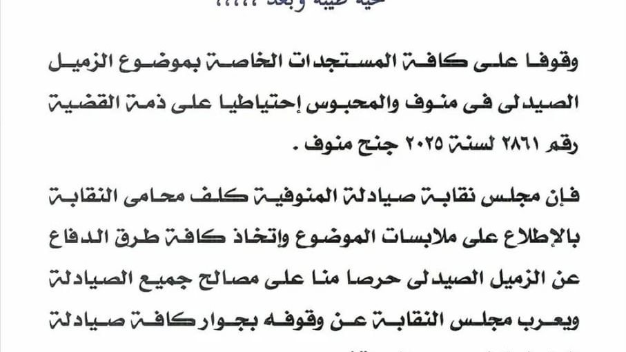 أعلنت نقابة صيادلة المنوفية متابعتها المستمرة لتطورات قضية الصيدلي المحتجز احتياطيًا على ذمة القضية رقم 2861 لسنة 2025 جنح منوف، والمتهم بتصوير سيدات وفتيات خلسة داخل إحدى الصيدليات بمدينة منوف.