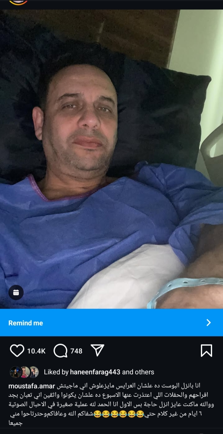 ونشر مصطفى قمر صورة له من خلال حسابه الرسمي عبر موقع تبادل الصور والفديوهات القصيرة إنستجرام، وكتب: "انا بانزل البوست ده علشان العرايس والحفلات اللي اعتذرت عنها الاسبوع ده علشان يكونوا واثقين اني تعبان بجد ووالله ماكنت عايز انزل حاجة بس الاول انا الحمد لله عملية صغيرة في الاحبال ٦ ايام من غير كلام حتي الصوتية وحترتاحوا مني شفاكم الله وعافاكم جميعا."