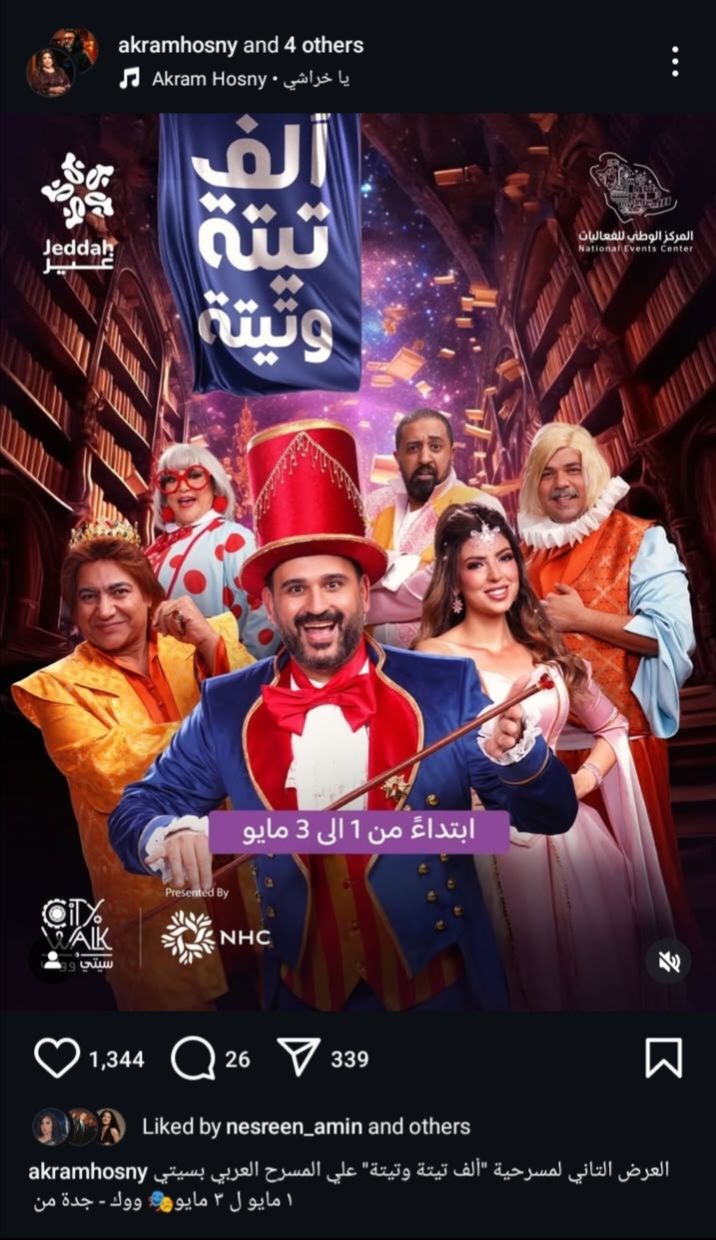 يستعد النجم أكرم حسني لـ العرض الثاني لمسرحية ألف تيتة وتيتة في جدة، وذلك بعد تألقه في مسلسل الكابتن الذي عُرض في موسم دراما رمضان 2025، وحقق نجاح كبير.