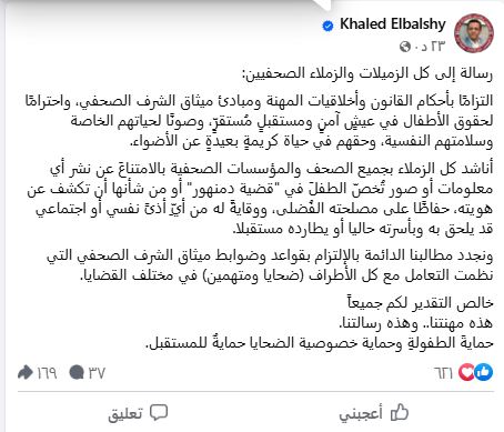 واستكمل: "ونجدد مطالبنا الدائمة بالإلتزام بقواعد وضوابط ميثاق الشرف الصحفي التي نظمت التعامل مع كل الأطراف (ضحايا ومتهمين) في مختلف القضايا، خالص التقدير لكم جميعاً، هذه مهنتنا.. وهذه رسالتنا، حمايةَ الطفولةِ وحماية خصوصية الضحايا حمايةٌ للمستقبل".