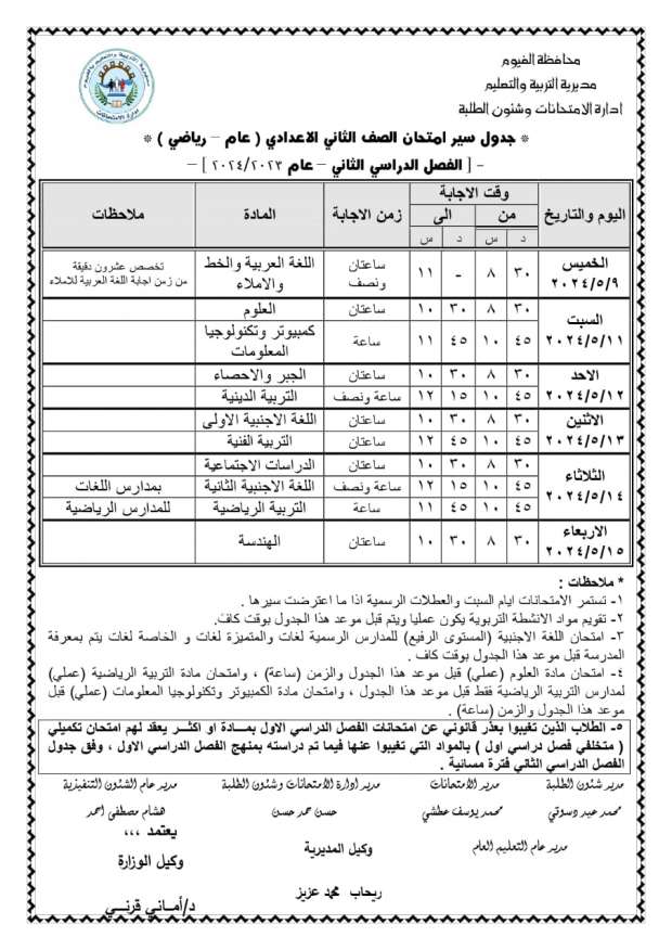 جدول امتحانات الصف الثاني الإعدادي الترم الثاني 2025