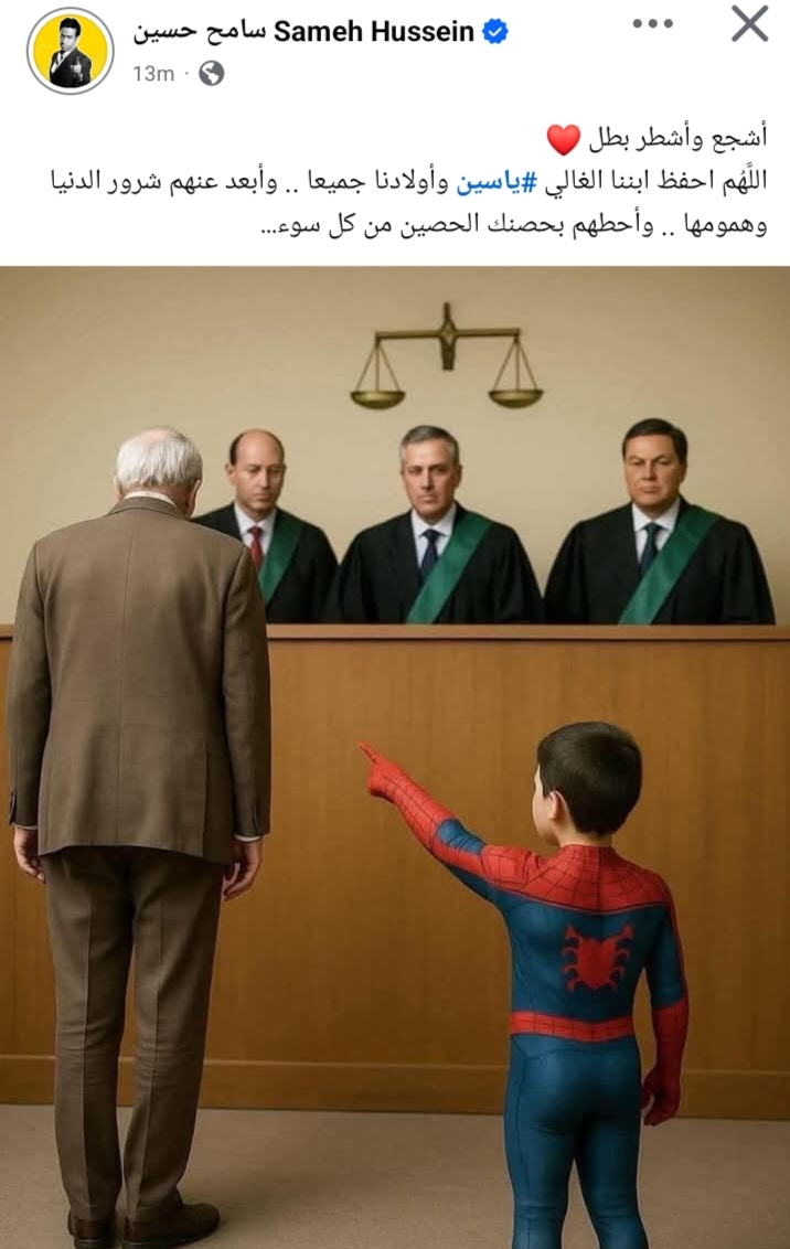 ونشر سامح حسين صورة طفل صغير يرتدي ملابس سبايدر مان مشيرًا أنه الطفل ياسين، الذي ذهب للمحكمة مرتديًا هذه الملابس لموجهة الأشرار و للحافظ علي هويتة، وذلك من خلال حسابه الرسمي عبر موقع التواصل الاجتماعي" فيسبوك"، وكتب: "أشجع وأشطر بطل.. اللهم احفظ ابننا الغالي ياسين واولادنا جميعًا.. وأبعد عنهم شرور الدنيا وهمومها.. وأحطهم بحصنك الحصين من كل سوء".