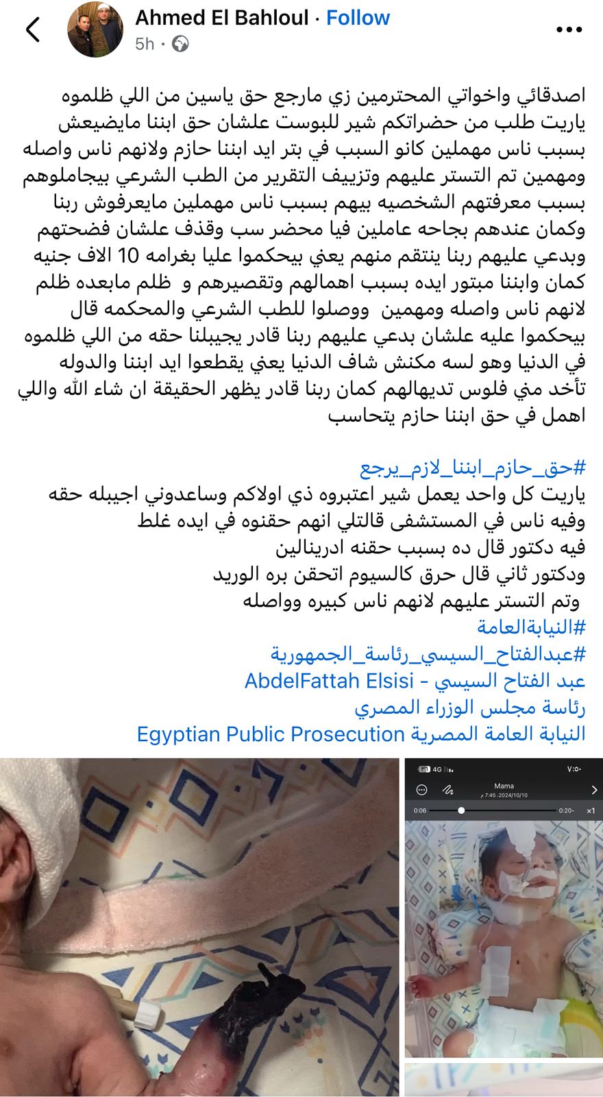 استغاث أب بالنيابة العامة ومجلس الوزراء والمسؤولين فى الدولة للحصول على حق اينه الرضيع بعد بتر يده بسبب الإهمال الطبي.