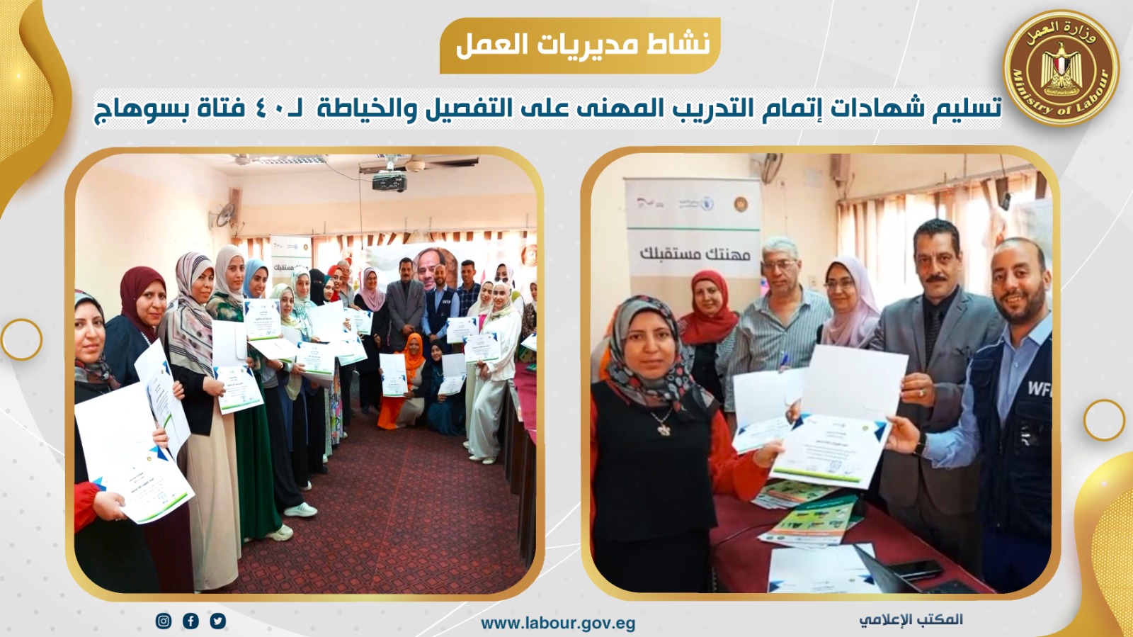 سلمت مديرية العمل بمحافظة سوهاج شهادات إتمام البرامج التدريبية المهنية لعدد 40 فتاة واللاتي جرى تدريبهن على مهنتي الخياطة والتطريز بالتعاون مع برنامج الأغذية العالمي WFP ، وذلك بمركزي التدريب المهني بسوهاج والكوثر.